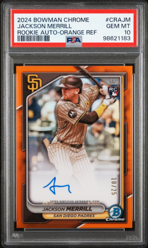 2024 Bowman Chrome Chrome Rookie Autographs Jackson Merrill Rookie Auto-Orange Ref PSA 10