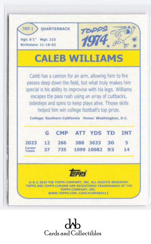 2024 Topps Chrome #74TF-1 Caleb Williams 1974 Topps Football Pink Refractor