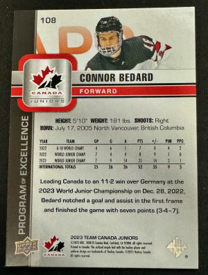 2023 Upper Deck Team Canada Juniors Connor Bedard #108 Program of Excellence