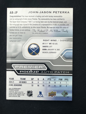 2021-22 UD Premier JJ Peterka Super Rookie Auto /99 Sabres