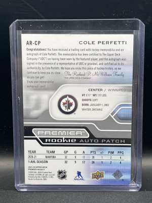 2021 Upper Deck Premier Cole Perfetti Rookie 3-color Patch Auto /99