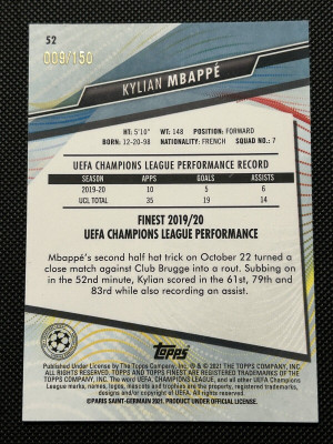 Kylian Mbappe 2020-21 Finest UEFA Champions League Blue Refractor #52 /150 PSG