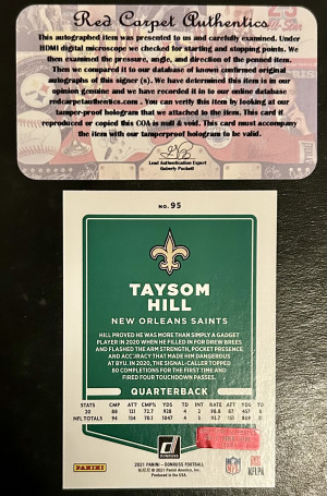 Taysom Hill Auto COA New Orleans Saints Panini Donruss Football