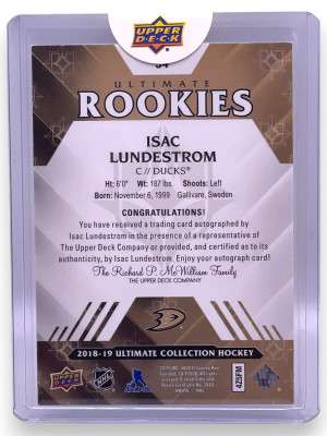 2018-19 Upper Deck Ultimate Collection #54 Isac Lundestrom #/299 Rookie AU,RC,SN