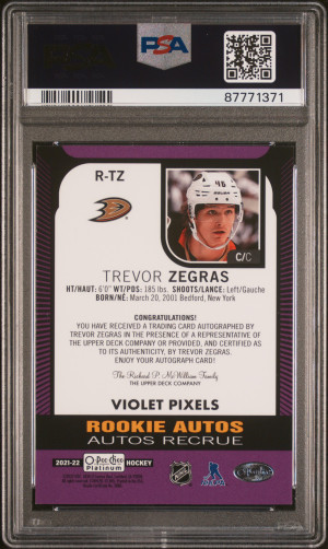 2021 Upper Deck O-Pee-Chee Platinum Rookie Autograph Trevor Zegras Rookie Auto-Violet Pixels