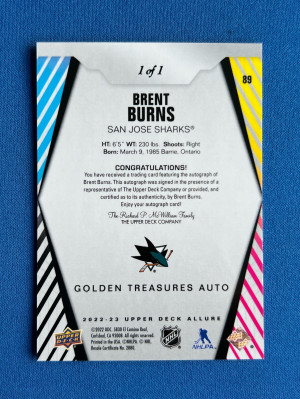 2022-23 Upper Deck Allure Brent Burns Golden Treasures Auto 1/1 One Of One!