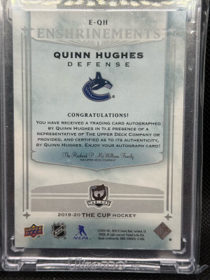 2019 Upper Deck The Cup Quinn Hughes RC Enshrinements Auto #\99