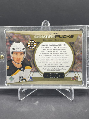 2020-21 UD Trilogy Gold Signature Pucks Connor Clifton Rookie Auto /21