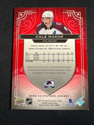 Cale Makar /33 made Photo Variant Red Stature 2022-23 Hockey Card 77