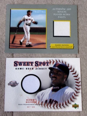 (2) Barry Bonds Pants & Jersey Relics 2005 Topps & 2001 Sweet Spot