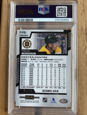 Patrice Bergeron 2020-21 O-Pee-Chee Platinum Preview Seismic Gold /25 PSA 10 POP 1