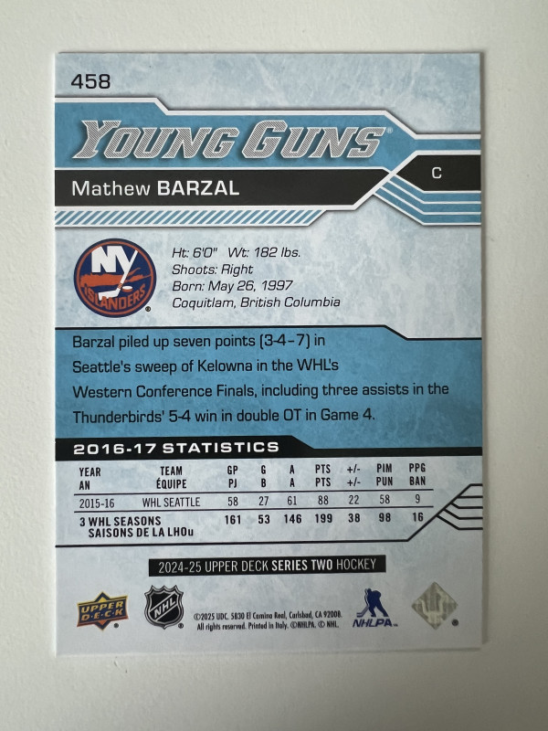 You are purchasing a 2025 2017-18 Upper Deck Young Guns Mathew Barzal #458 Rookie. You will receive the exact item in the photographs. Thank you for looking.