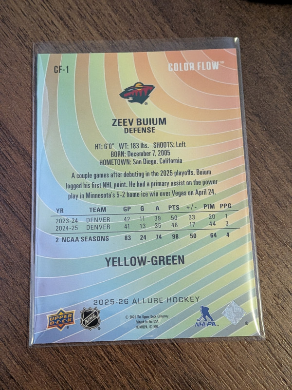 Zeev Buium Rookie 2025-26 Upper Deck Allure Color FLow Yellow-Green Minnesota Vancouver