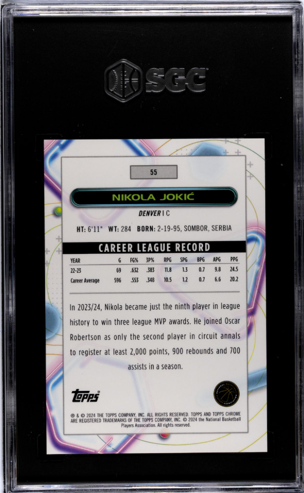 You are purchasing a 2023 Topps Cosmic Chrome Nikola Jokic #55 Gold Interstellar Refractor SGC 10. You will receive the exact item in the photographs. Thank you for looking.