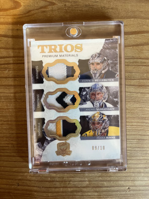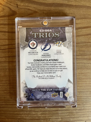 2017-18 The Cup Trios #C3-GOA Connor Hellebuyck Andrei Vasilevskiy Pekka Rinne Jersey Gold Premium Material Triple Patch 9/10