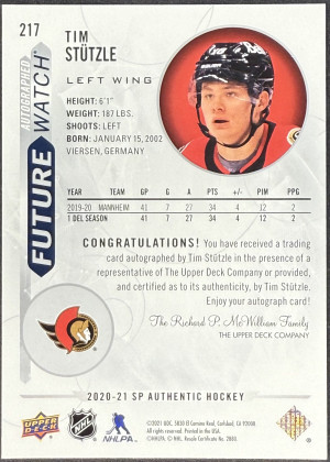 2020-21 SP Authentic Tim Stutzle Future Watch Auto /999