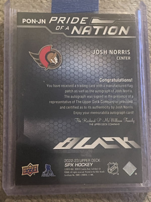 2022-23 SPx UD Black Pride Of A Nation Patch /99 Josh Norris #PON-JN Patch Auto