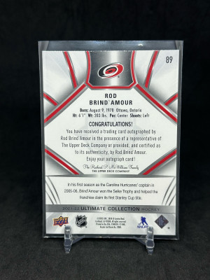 Rod Brind’Amour 2021-22 Upper Deck Ultimate Collection Legends On Card Auto #89 Hurricanes
