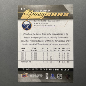 2015-16 UPPER DECK LINUS ULLMARK YOUNG GUNS EXCLUSIVES /100