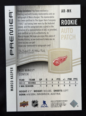 2023-24 Upper Deck Premier Rookie Auto Patch 14/99 #ARMK Marco Kasper