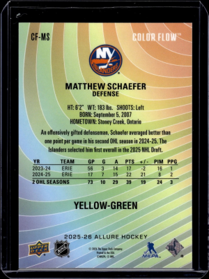 2025-26 Upper Deck Allure #CF-MS Matthew Schaefer Color Flow Yellow-Green RC