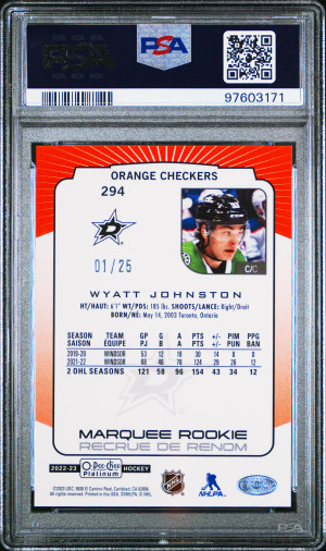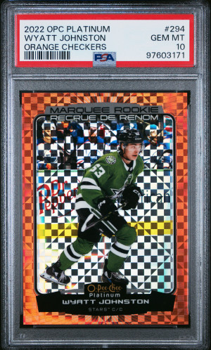 22/23 OPC PLATINUM ORANGE CHECKERS ROOKIE #294 WYATT JOHNSTON RC (01/25) PSA 10 - POP 5