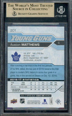 2017-17 UPPER DECK HOCKEY - AUSTON MATTHEWS #201 YOUNG GUNS BECKETT PRISTINE 10 GOLD LABEL