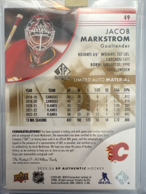 Jacob Markstrom, 2023-24 SP Authentic, Limited Auto Material /100