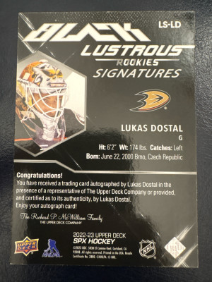 Lukas Dostal, 2022-23 SPx Hockey, Black Lustrous Rookie Signatures /299