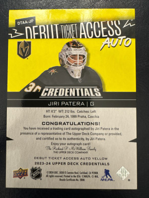 Jiri Patera, 2023-24 Credentials, Debut Ticket Access Auto Yellow /125