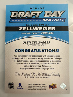 Olen Zellweger, 2024-25 SP Game Used, Draft Day Marks, Auto /35