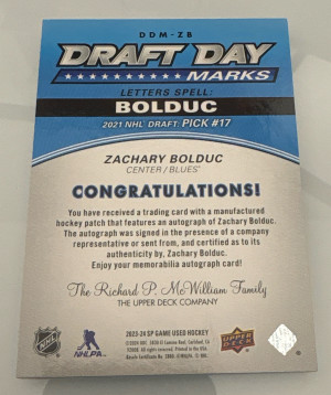 Zachary Bolduc, 2023-24 SP Game Used, Draft Day Marks, Auto /35