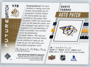 2019-20 SP Authentic Dante Fabbro Future Watch Rookie Patch Auto /100