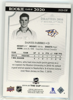 2019-20 The Cup Dante Fabbro Rookie Class of 2020 Autograph 1/75 #2020-DF