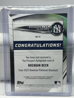 2022 Bowman Platinum Brendan Beck Rookie Prospect Auto RC Card #TOP-91 Yankees