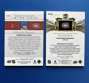 2020-21 UD The Cup - Alexander Romanov Exquisite Collection Limited Logos Rookie Auto Patch JERSEY-NUMBER RPA 27/50 #LLT-AR & Signature Materials Rookies Auto Patch /99 #SO-AR