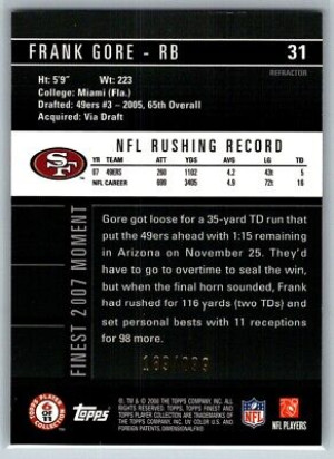 Frank Gore 2008 Topps Finest Refractor 189/299 #31 San Francisco 49ers