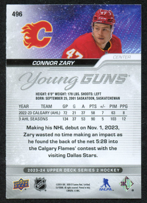 2023 Upper Deck Outburst Silver Connor Zary #496 Young Guns YG