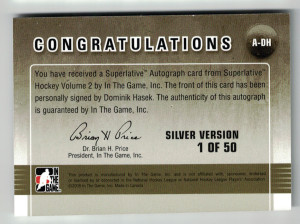 2009-10 In The Game ITG Superlative Hockey Dominik Hasek Silver Version 1 of 50 Autograph A-DH
