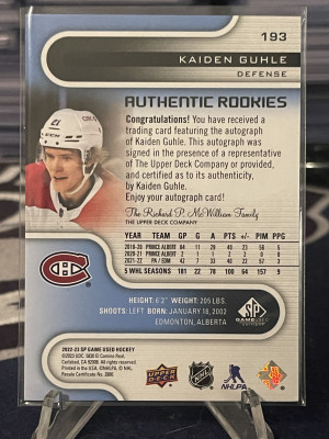 22/23 2022 SP GAME USED KAIDEN GUHLE #193 AUTHENTIC ROOKIES BLUE AUTOGRAPH AUTO