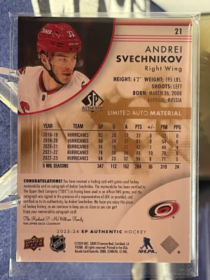 2023-24 UD SP Authentic Andrei Svechnikov Limited Auto Material /50