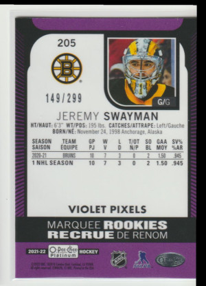 O-Pee-Chee Platinum Violet Pixels Jeremy Swayman #205 149/299