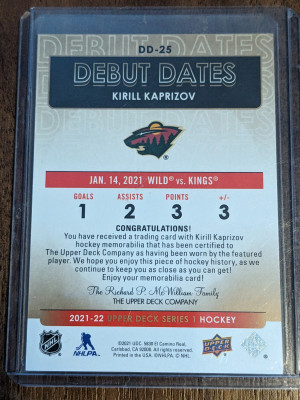 2021-22 Upper Deck Series 1 Debut Dates Jersey Gold Kirill Kaprizov DD-25