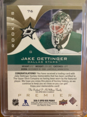2020-21 Premier Rookie Jake Oettinger Patch /49