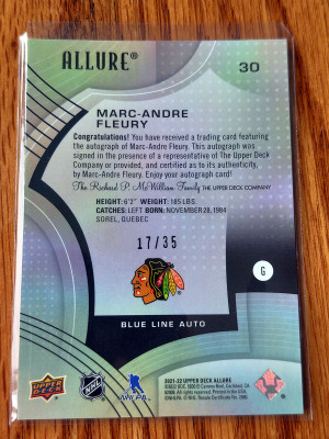 2021-22 Allure Marc-Andre Fleury #30 Blue Line Auto 17/35 Blackhawks