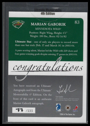2004 Marian Gaborik Ultimate Memorabilia 4th Edition In The Game