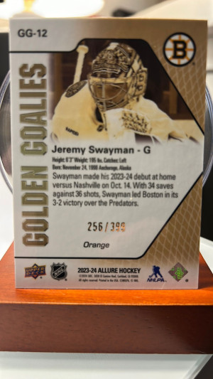 2023-24 Upper Deck Allure Jeremy Swayman #GG-12 Orange Golden Goalies /399