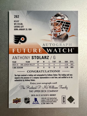 2015-16 SP Authentic Anthony Stolarz Rookie Future Watch Auto /999