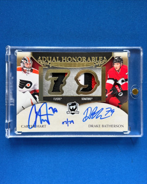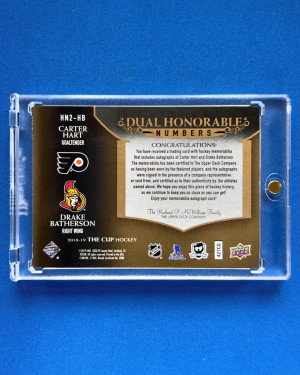 2018-19 The Cup Dual Honorable Numbers - Drake Batherson & Carter Hart Rookie Auto Patch 07/79 #HN2-HB