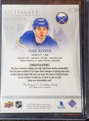 2023-24 ULTIMATE COLLECTION ROOKIES ROOKIE RC /599 PATCH ISAK ROSEN SABRES NHL!